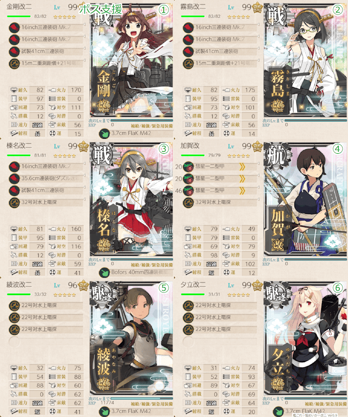 - 道中に敵空母は出現せず、対空カットインはボスマスだけに有効なので優先度は低く、どちらかと言うと運の高い駆逐で魚雷カットインを狙った方が現実的な印象。